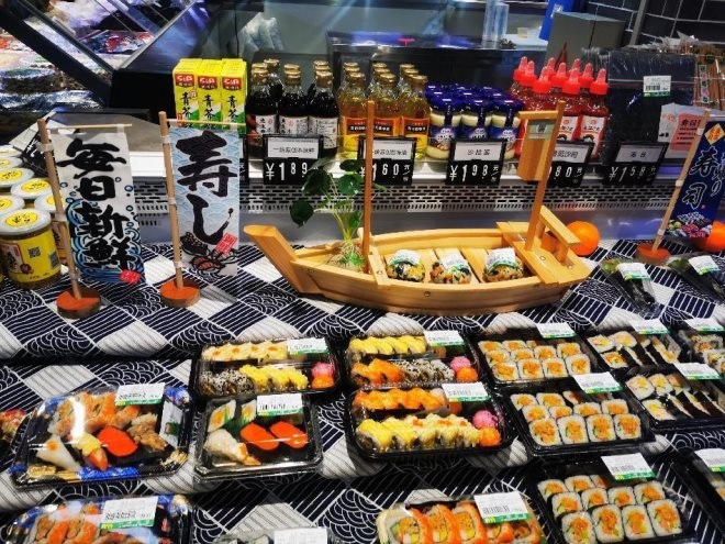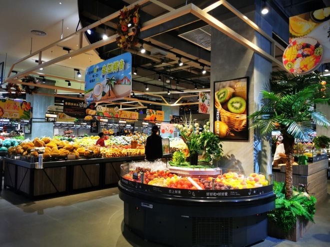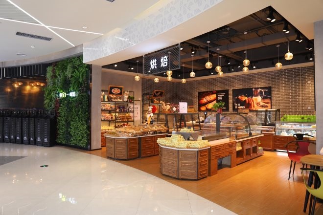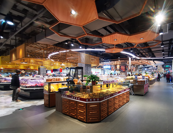 黑白相間的工業(yè)風(fēng)吊頂、灰色墻面柱體、加上藝術(shù)表現(xiàn)手法的手繪點(diǎn)綴,與場景化商品美陳融為一體,勾勒出一幅具有時(shí)代逼格的生活博物館。一峰超市所呈現(xiàn)出的視覺效果,精致優(yōu)美、干凈明快、溫馨舒適、自然溫雅,有著超市最新潮流本土化落地的影子,打造愛逛、愛購、樂享的全新消費(fèi)體驗(yàn),實(shí)現(xiàn)年輕人沉浸式悅己場景與消費(fèi)需求的完美融合。
