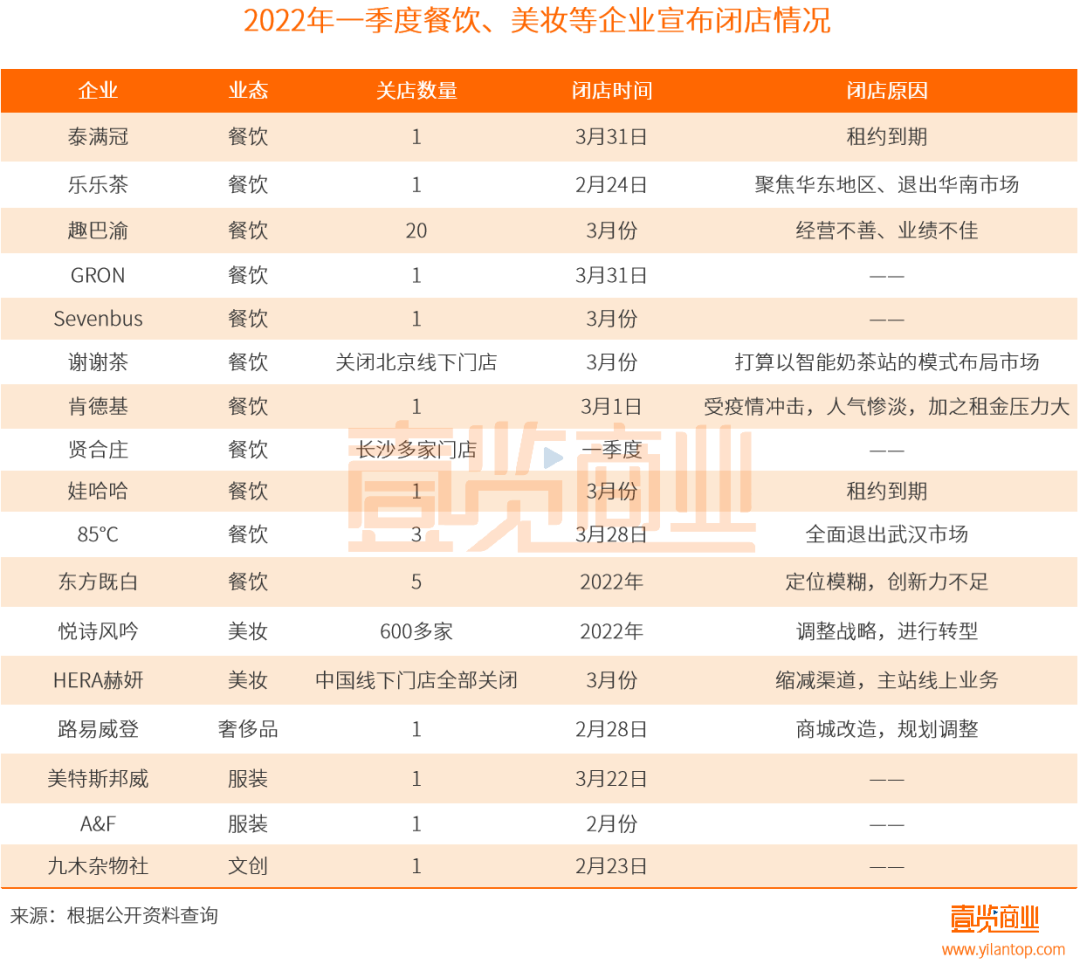 另外,據(jù)壹覽商業(yè)不完全統(tǒng)計,2022年一季度,國內(nèi)有近700家門店宣布閉店,其中不乏沃爾瑪、路易威登、肯德基等知名品牌。更有甚者,如趣巴渝、85°C、悅詩風(fēng)吟等企業(yè)還出現(xiàn)大規(guī)模關(guān)店的情況。