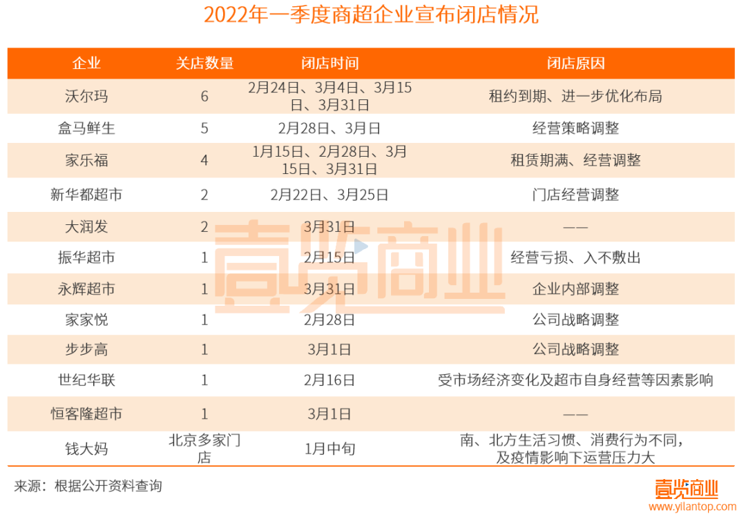 有數(shù)據(jù)統(tǒng)計,2017年和2018年,14家超市上市公司共關(guān)閉1390家門店,平均一天關(guān)閉兩家店。而到了2019年,國內(nèi)的27家超市企業(yè)共新開1533家門店,但同時也至少關(guān)閉門店501家。發(fā)展至2020年,超市之王“華潤萬家”在一年時間里關(guān)掉800多家門店,永輝超市關(guān)店349家。另外,像沃爾瑪這樣的商超巨頭也不能幸免,不完全統(tǒng)計,從2016年到2021年五年時間里,沃爾瑪在中國關(guān)閉大賣場100多家。