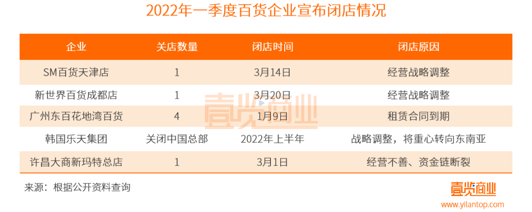 2022年一季度,百貨行業(yè)有5家門店宣布閉店,其中,SM百貨天津店、新世界百貨成都店因“經(jīng)營戰(zhàn)略調(diào)整”而關(guān)閉門店;廣州東百花地灣百貨是在租賃到期后選擇關(guān)閉門店;韓國樂天集團(tuán)因戰(zhàn)略調(diào)整,預(yù)將重心轉(zhuǎn)向東南亞,而關(guān)閉中國總部;大商新瑪特則是因經(jīng)營不善、資金鏈斷裂,選擇關(guān)閉許昌總店。