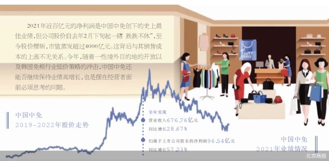 2021年近百億元的凈利潤是中國中免創(chuàng)下的史上最佳業(yè)績,但公司股價自去年2月下旬起一路“跌跌不休”,至今股價腰斬,市值蒸發(fā)超過4000億元。