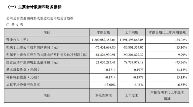 報告期內(nèi),人人樂實現(xiàn)營收12.09億元,同比下降24.02%;歸屬上市公司股東的凈虧損7543.17萬元,去年同期凈虧損為8680.16萬元,同比收窄;基本每股收益虧損0.1714元,去年同期基本每股收益虧損0.1973元,同比收窄。
