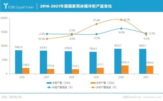 其實自疫情以來,家用冰柜和冰箱的銷量都有明顯增長,其中冰柜的增幅尤為顯著。國家統(tǒng)計局?jǐn)?shù)據(jù)顯示,2020年冰箱產(chǎn)量為9014.7萬臺,同比增長14.0%;冷柜產(chǎn)量為3042.4萬臺,同比增長更是達(dá)到40.1%。