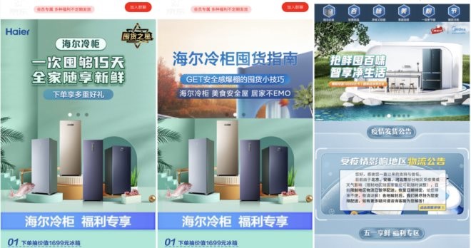 4月18日,海爾冷柜公眾號推送了一篇名為《春季囤貨新姿態(tài),冷柜成為好幫手》的文章,教用戶如何用冷柜囤貨,并稱“特殊時期為了家人吃充足,一臺冰柜能滿足你的想象”。在京東平臺,海爾還上線了“一次囤夠15天,全家隨享新鮮”的活動。