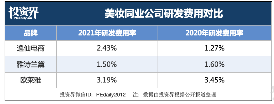 如果更直觀些來看,2021年逸仙電商的研發(fā)費用率為2.43%,2020年為1.27%,而雅詩蘭黛分別為1.5%、1.6%,歐萊雅集團則為3.19%、3.45%(見下圖)。這意味著逸仙電商在研發(fā)上不僅位居國貨美妝集團中投入頭部位置,同時費率正在向國際一線化妝品公司看齊。