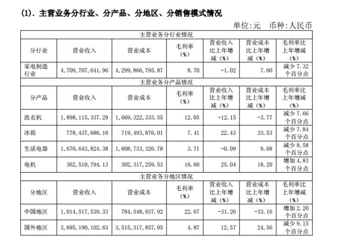 盡管惠而浦國(guó)外地區(qū)收入有較大幅增長(zhǎng),但毛利率僅4.87%,遠(yuǎn)不及中國(guó)地區(qū)的22.67%。