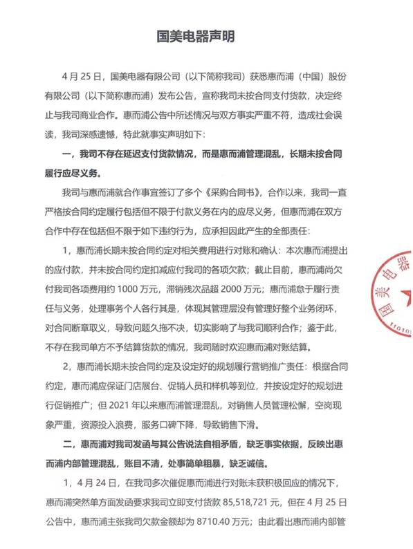 4月25日晚間,惠而浦突然發(fā)布一則公告表示,基于國(guó)美電器在支付貨款方面未按合同執(zhí)行,長(zhǎng)期出現(xiàn)延遲的情況,從2022年4月起支付貨款情況持續(xù)惡化,加上近期資本市場(chǎng)波動(dòng),從而導(dǎo)致公司管理層對(duì)國(guó)美電器未來(lái)償付能力的判斷發(fā)生重大變化。為防止風(fēng)險(xiǎn)繼續(xù)擴(kuò)大,公司經(jīng)綜合考慮決定終止和國(guó)美電器的商務(wù)合作關(guān)系。