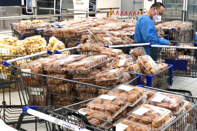 (圖:家樂福會(huì)員店各類烘焙套餐產(chǎn)品正在購(gòu)物車中分類整理準(zhǔn)備打包)