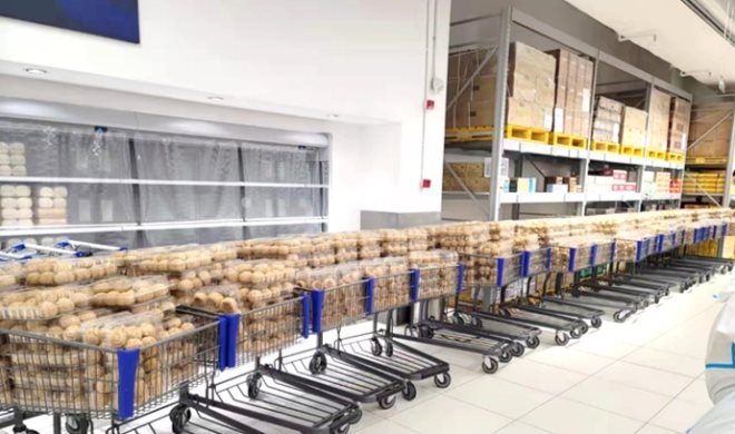 (圖:家樂福會(huì)員店購(gòu)物車中已經(jīng)烤制好的面包,正待打包分揀配送)