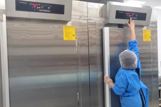(圖:家樂福會(huì)員店烘焙主管馬雪清將面包生胚放入醒發(fā)爐,并設(shè)置醒發(fā)時(shí)間和溫度)