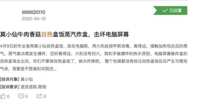 駝鹿新消費(fèi)在黑貓投訴平臺,就看到有網(wǎng)友投訴,在食用自熱米飯時(shí),不小心點(diǎn)燃了自熱米飯里的蒸汽,導(dǎo)致?lián)魤牧穗娔X屏幕。
