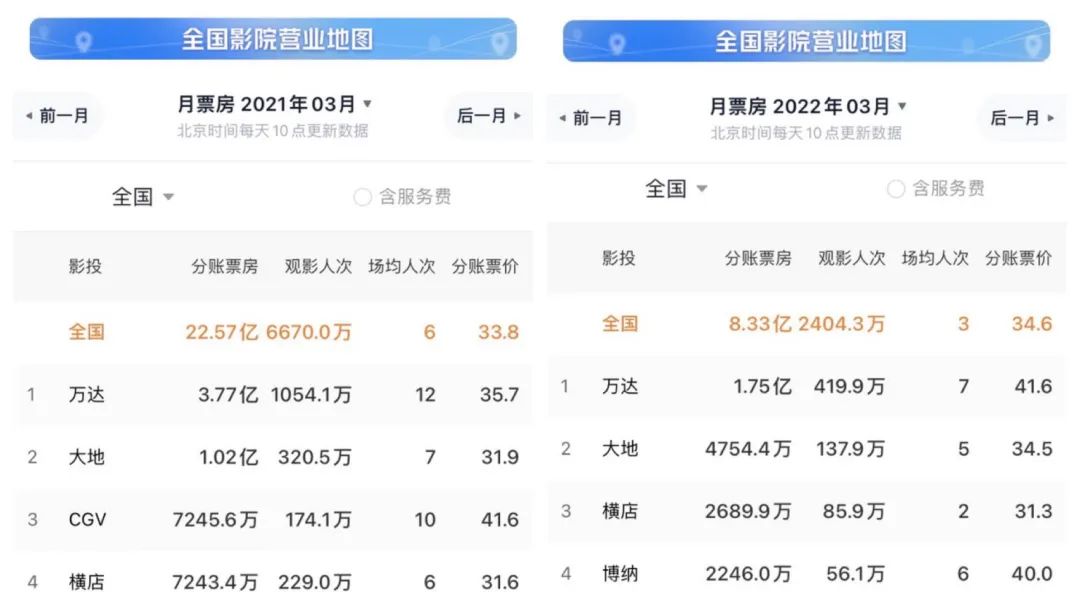 雖然萬達(dá)在2021年的凈利潤實(shí)現(xiàn)扭虧為盈,但2022年第一季度業(yè)績卻比較慘淡。燈塔專業(yè)版數(shù)據(jù)顯示,萬達(dá)電影今年3月的國內(nèi)分賬票房僅有1.75億元,僅有去年同期的一半。
