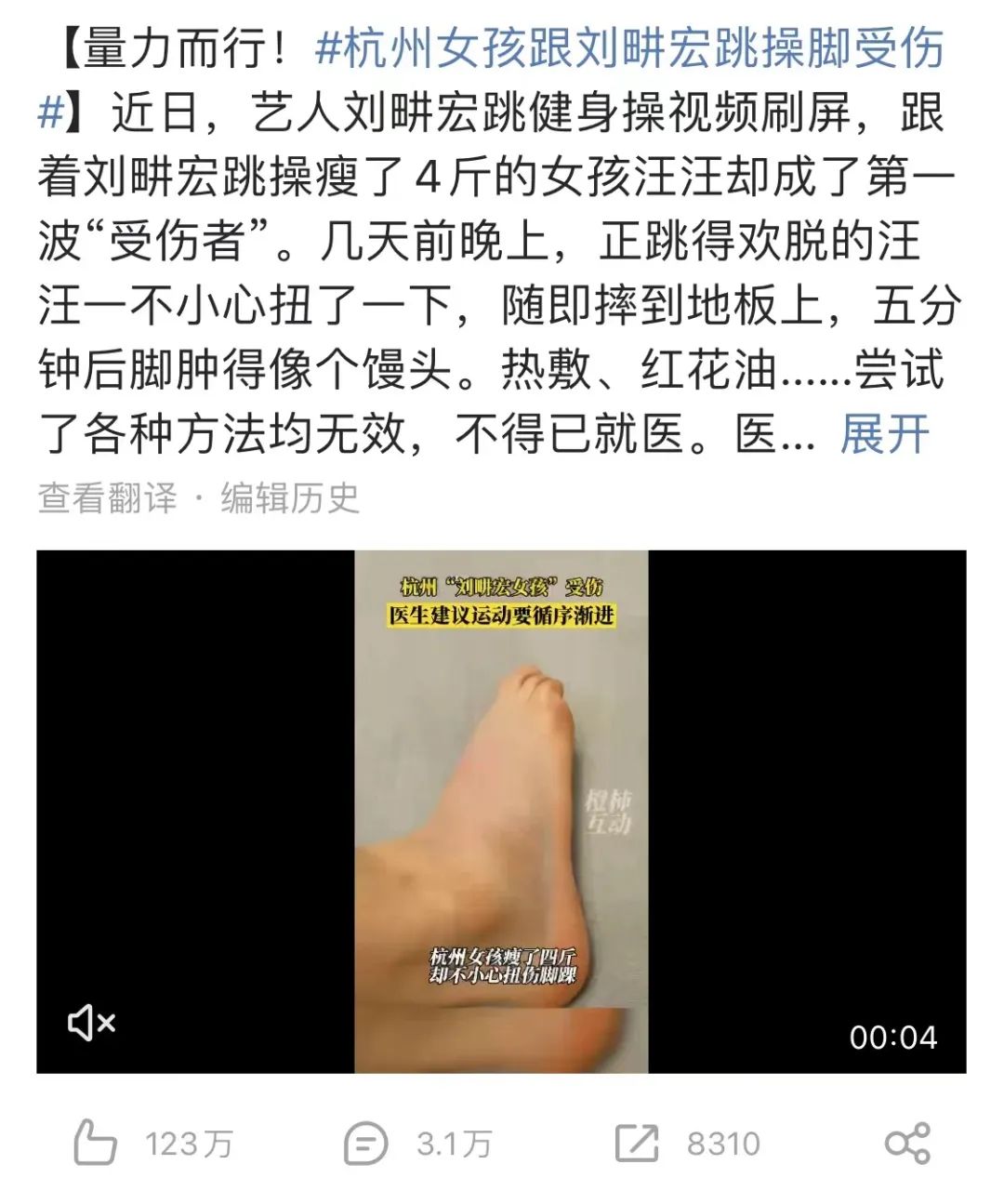除了受傷報道外,不少女孩更是在微博熱門話題為“成為劉畊宏女孩的第三天”曬出了自己的“鍛煉后遺癥”,輕則肌肉酸痛,下樓走出“大佬范”。因此,“劉畊宏燃脂操別亂練”的話題,也迅速受到關(guān)注。