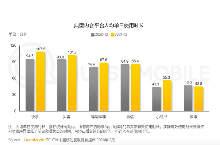 讓所有互聯(lián)網(wǎng)大廠非常在意的另一個(gè)數(shù)據(jù)是用戶時(shí)長(zhǎng)。截至2021年12月,小紅書(shū)人均單日使用時(shí)長(zhǎng)達(dá)到了55分鐘,在所有內(nèi)容平臺(tái)中位列第五。
