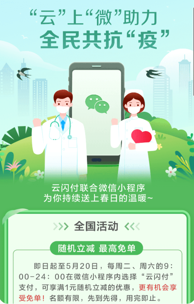 “隨機(jī)立減 最高免單!”五一假期來(lái)臨之際,有用戶發(fā)現(xiàn),微信支付聯(lián)合云閃付推出了“云”上“微”助力,全民共抗“疫”福利活動(dòng),多重優(yōu)惠回饋,可謂是福利多多,誠(chéng)意滿滿。