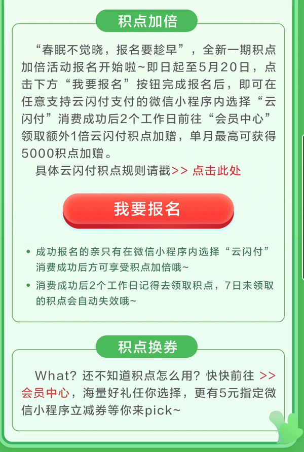 不僅如此,全新一期積點(diǎn)加倍福利也重磅回歸。從即日起到5月20日,用戶可在云閃付app搜索“微信小程序福利”參與報(bào)名,即可在任意支持云閃付支付的微信小程序內(nèi),選擇“云閃付”消費(fèi)成功后2個(gè)工作日前往云閃付App“會(huì)員中心”領(lǐng)取額外1倍的云閃付積點(diǎn)加贈(zèng),積點(diǎn)可在會(huì)員中心兌換滿20元減5元指定微信小程序立減券等好禮。