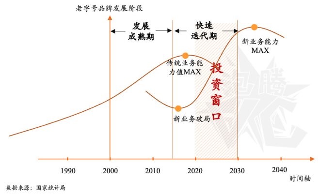 2020年到2030年,是老字號品牌的投資窗口期,傳統(tǒng)業(yè)務(wù)已經(jīng)成熟,收入平穩(wěn),而新業(yè)務(wù)也在破局,業(yè)績釋放,加速資本化。