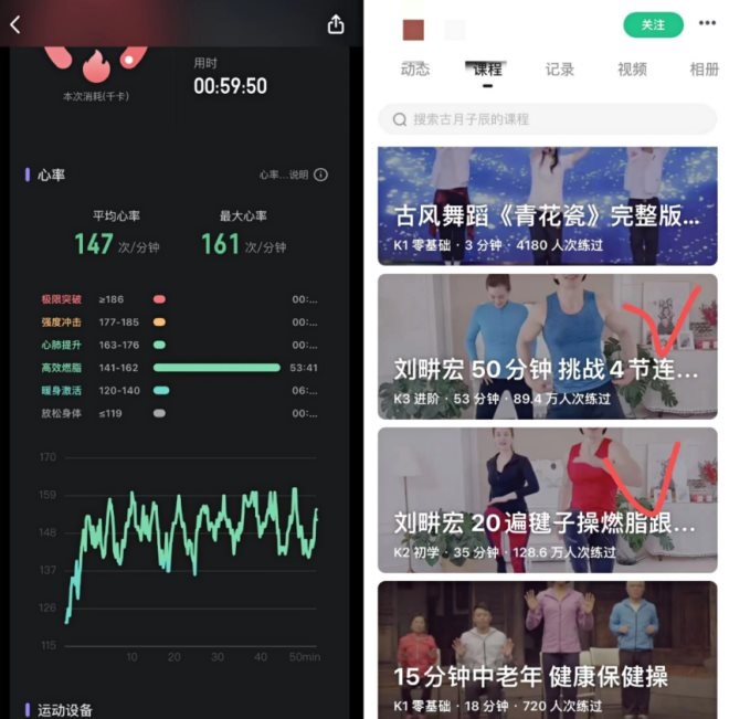 吳鶴是實打?qū)嵉摹边\動卷王”,自然不會錯過跟跳一番,讓她感到意外的是,90分鐘跟著連跳兩節(jié),竟然消耗了1600多卡路里,平均心率每分鐘147次,最大心率162次每分鐘。