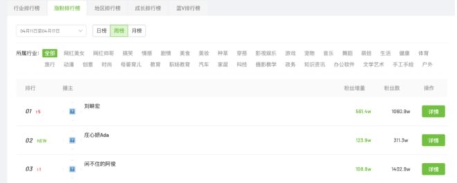 截至4月20日,飛瓜數(shù)據(jù)顯示,近一周以來,劉畊宏抖音直播間是全平臺漲粉排行榜首位,7天“直播漲粉”超過1000萬,新增點贊高達441.8萬。