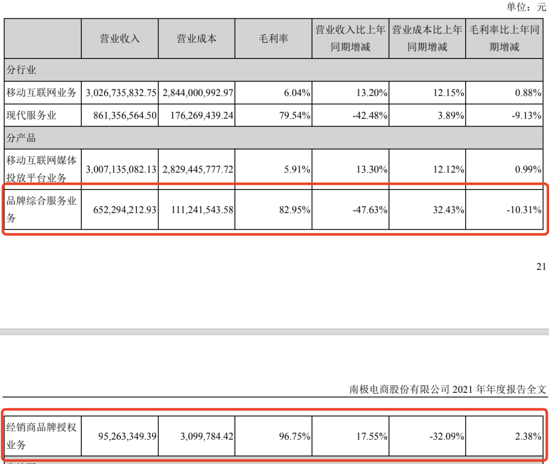 盡管南極電商收購而來的廣告營銷業(yè)務(wù)營收占比達(dá)到93.68%,但毛利率僅有6.04%;遠(yuǎn)低于南極電商本部業(yè)務(wù)中,品牌綜合服務(wù)業(yè)務(wù)毛利和經(jīng)銷商品牌授權(quán)業(yè)務(wù)毛利,后兩者分別為82.95%、96.75%,這正是“南極人賣吊牌,利潤堪比茅臺”的由來。