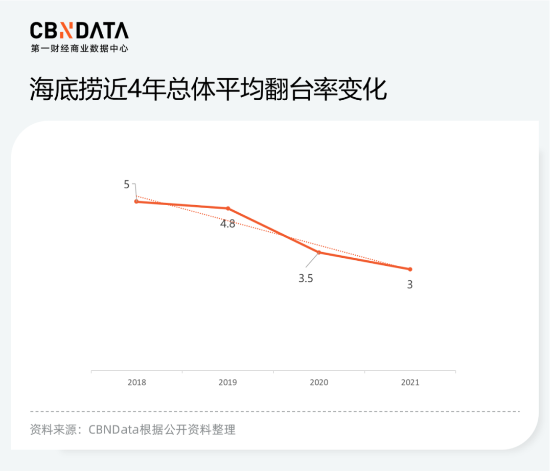 但對(duì)于海底撈來(lái)說(shuō),這次翻臺(tái)率的下降就沒有可以彌補(bǔ)的余地了。平均每天3次的翻臺(tái)率,是近5年來(lái)的最低水平。