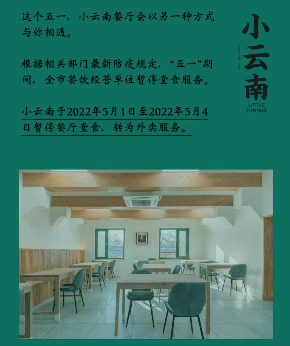 “響應(yīng)政府號召暫停堂食,5月1日至5月4日堂食暫停,門店內(nèi)支持外賣和自提”