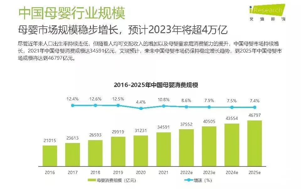 這一市場的體量,根據(jù)3月28日艾瑞咨詢發(fā)布的《中國母嬰行業(yè)研究報告》, 2021年中國母嬰消費規(guī)模達(dá)34591億元,到2025年中國母嬰市場規(guī)模將達(dá)到46797億元。