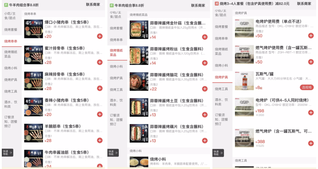 在燒烤的外賣點(diǎn)單頁面,不僅標(biāo)注了用料和烤制時(shí)間,還有烤爐、瓦斯氣、刷子、夾子等燒烤工具可購買,一站式采購,極其方便。