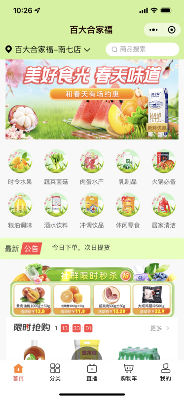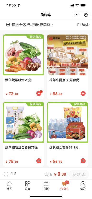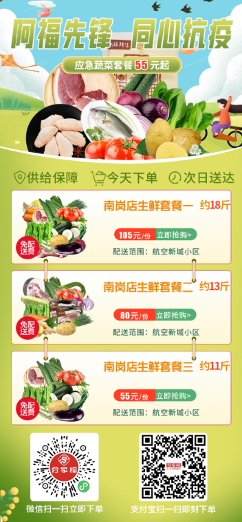 面對突發(fā)的疫情,百大合家福攜手中皖知托付一起,共同展開了“阿福先鋒,同心抗疫”行動,借助京東到家、餓了么、美團等線上平臺為市民展開了豐富的商品供應(yīng);同時,通過小程序為顧客提供不同種類的“生鮮組合套餐”,及時滿足疫情期間百姓的物資購買需求。顧客進入線上平臺和小程序時,即可輕松購買到各類米、面、糧、油、肉、蛋、菜、奶及防疫清潔等優(yōu)質(zhì)日用商品。
