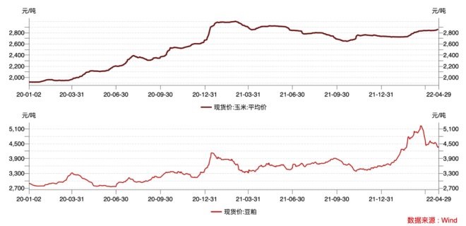 玉米、豆粕現(xiàn)貨價(jià)格走勢,圖片來源:Wind