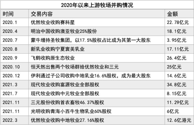 2019年7月,新希望乳業(yè)出資7.09億元入股現(xiàn)代牧業(yè),成為其第二大股東;次年,北京三元收購首農(nóng)畜牧46.37%的股權(quán);一向頗為保守的光明也宣布擬募資19億擴(kuò)建牧場。