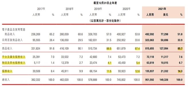 數(shù)據(jù)來源:京東2021年財報 單位:百萬元