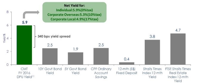 圖,CapitaLand Mall Trust 2017第一季度收益與其他投資品類之間的比較,資料來源:官網(wǎng),Bloomberg,Central Provident Fund Board, Monetary Authority of Singapore