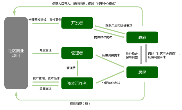 3)產(chǎn)業(yè)鏈相對較長,涉及的利益關(guān)聯(lián)體多元化。這是由其本身的房地產(chǎn)屬性決定的。社區(qū)商業(yè)的產(chǎn)業(yè)鏈涉及到政府、開發(fā)建設(shè)方、運(yùn)營方、品牌商、資本方及終端消費(fèi)客群等不同的主體,每個主體都有不同的責(zé)任與訴求。