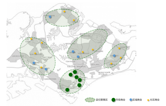 圖,新加坡市級商業(yè)、區(qū)域商業(yè)、社區(qū)商業(yè)分布,資料來源:《中國社區(qū)商業(yè)規(guī)范化研究》