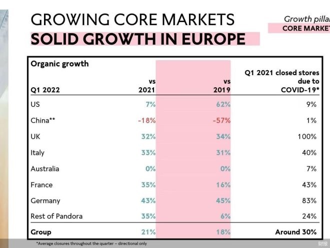 潘多拉銷售額在歐洲和美國均實現(xiàn)不同程度增長的同時,其在中國市場的表現(xiàn)卻依舊疲軟。財報顯示,美國市場有機增長較2021年第一季度增長7%,英國和意大利更是實現(xiàn)了32%和33%的增長。但中國市場相比于2021年同期收入下滑18%,相比于2019年同期則下滑了57%。
