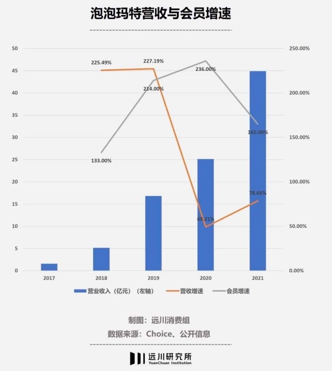 在2020年和2021年,泡泡瑪特的注冊(cè)會(huì)員數(shù)分別為740萬(wàn)(同比增長(zhǎng)236%)和1958萬(wàn)(165%),但營(yíng)收增速卻分別只錄得49.3%和78.7%。
