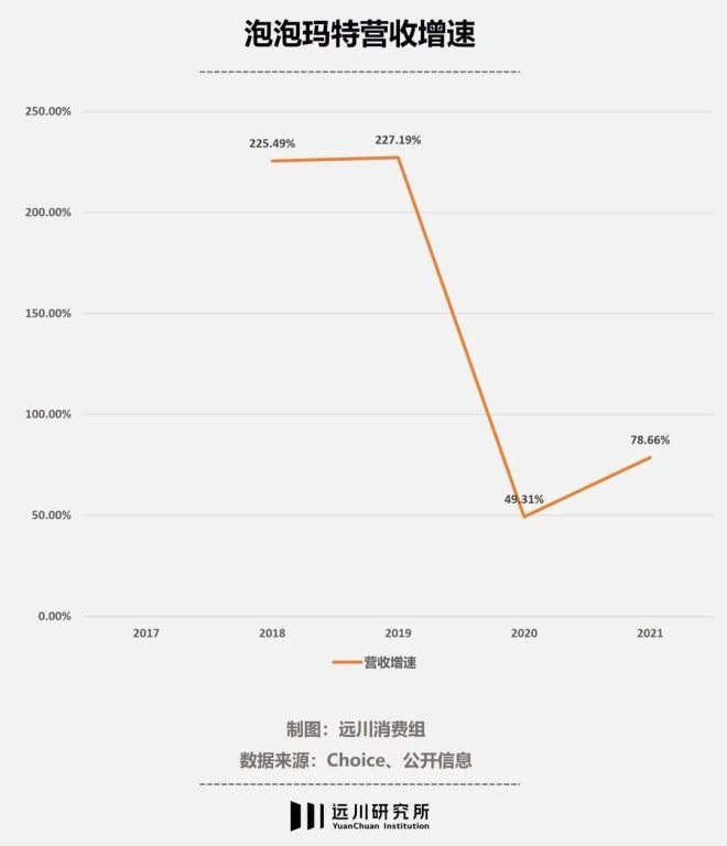 2021年2月17日的高位之后,泡泡瑪特的市值在震蕩中一路下行,如今已不到高點(diǎn)的三分之一。就在下跌開始后不久,2021年3月26日,泡泡瑪特發(fā)布2020年財(cái)報(bào),營(yíng)收的同比增速一落千丈:49.3%。