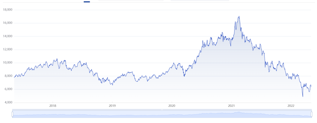 由中證指數(shù)有限公司編制的中概互聯(lián)50指數(shù)囊括了國內(nèi)主要互聯(lián)網(wǎng)巨頭,中證指數(shù)官網(wǎng)顯示,截至5月5日,該指數(shù)點位為6335.30點,相當(dāng)于2017年初水平,近一年跌幅高達(dá)50.78%,PE為17.22倍。而去年同期,該指數(shù)PE在50倍以上。