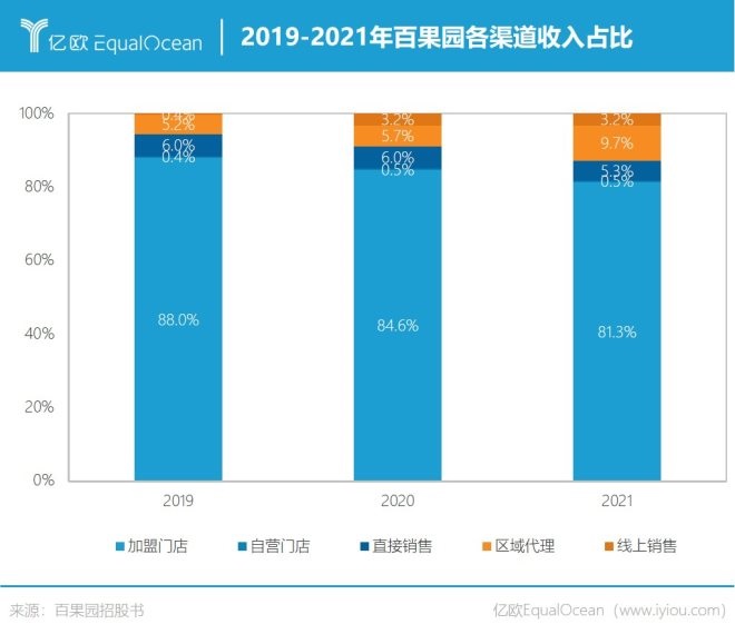 根據(jù)招股書,2019-2021年,百果園的營業(yè)收入分別為89.76億元、88.54億元、102.89億元,其中大部分收入來源于加盟門店。盡管加盟門店的銷售收入占比從2019年的88.0%下降到2021年的81.3%,但依然是公司最主要的營收支柱。