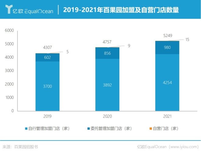 目前百果園的5351家門店中,有5336家為加盟門店,只有15家為自營門店。所有加盟門店中,4382家為自行管理,其余954家是委托區(qū)域代理管理。