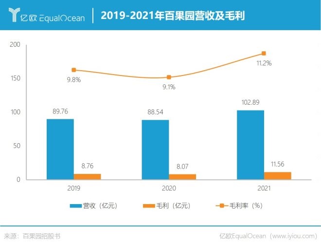 2019-2021年,百果園的毛利分別為8.76億元、8.07億元與11.56億元,毛利率分別為9.8%、9.1%及11.2%。同期,凈利潤分別為2.49億元、0.49億元與2.35億元,凈利潤率分別為2.8%、0.5%及2.2%。