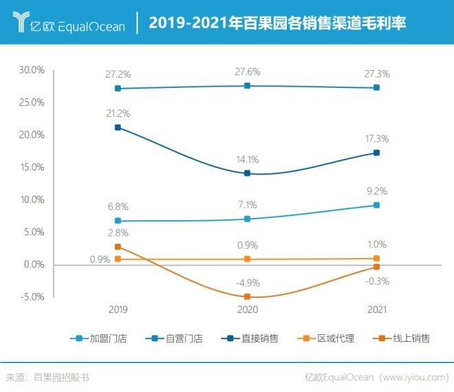 但目前為止,百果園線上渠道的收入非常有限。根據(jù)招股書,2019-2021年百果園線上渠道銷售收入分別為0.33億元、2.79億元、3.26億元,只占到總營收的0.4%、3.2%、3.2%;2020和2021年線上渠道的毛利率甚至是負(fù)數(shù),分別為-4.9%和-0.3%。