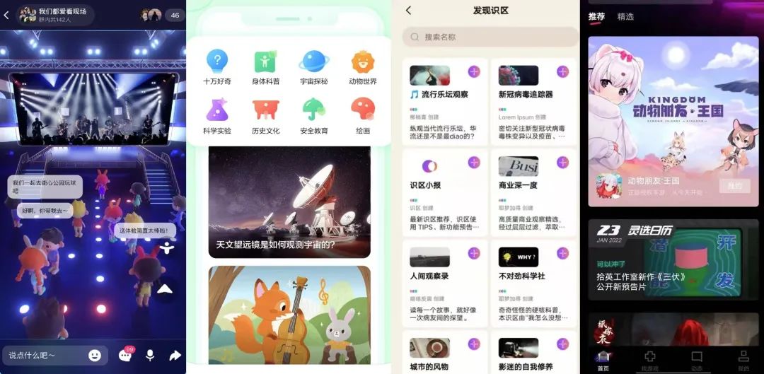 這其中,派對島定位是“實景化的實時線上活動社區(qū)”,用戶可用虛擬形象進行實時聊天互動,參加各種線上活動。對比來看這一應用和去年百度推出的“希壤”、今年年初大火的“啫喱”玩法相似,同屬搭上了元宇宙的產(chǎn)品。識區(qū)屬于興趣社區(qū)賽道,與豆瓣相似,用戶可在APP自由發(fā)帖和瀏覽各類內容。靈選和好奇小知則更加垂類,前者主要針對游戲,后者主打青少年學習。