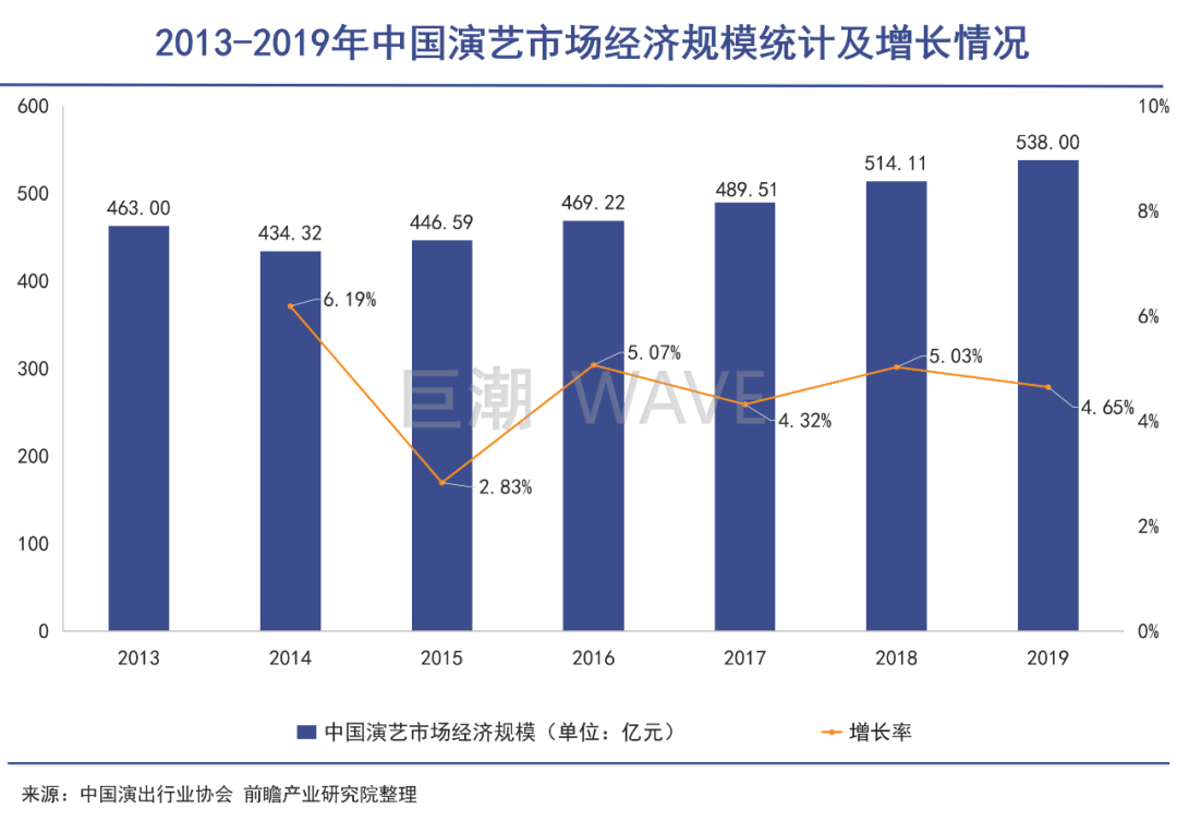 如果我們拋開疫情的因素再來看,2019年之前中國的演藝市場已經連續(xù)呈穩(wěn)定增長趨勢,具備隨時突破的潛力。