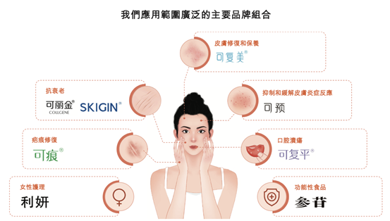 截至2021年,巨子生物產(chǎn)品組合共有105項SKU,涵蓋功效性護膚品、醫(yī)用敷料和功能性食品的八大主要品牌,即可復美、可麗金、可預、可痕、可復平、利妍、欣苷(SKIGIN )及參苷,目前在中國功效性護膚品市場,透明質酸和膠原蛋白是兩種接受度最高的成分,因此招股書中也著重介紹了膠原蛋白與透明質酸(玻尿酸)的對比,膠原蛋白的優(yōu)勢在于皮膚修復和抗衰老的功效。