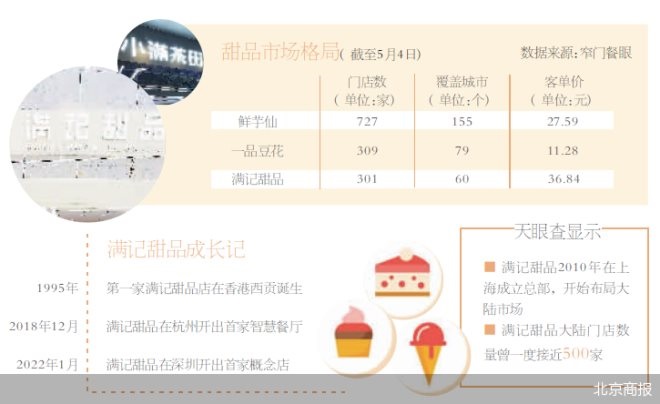 公開資料顯示,1995年第一家滿記甜品店在香港西貢誕生,后在上海、北京、重慶等多個城市開設(shè)門店。而小滿茶田成立于2019年,主打以車?yán)遄拥人谱鞯娘嬈贰?/p>