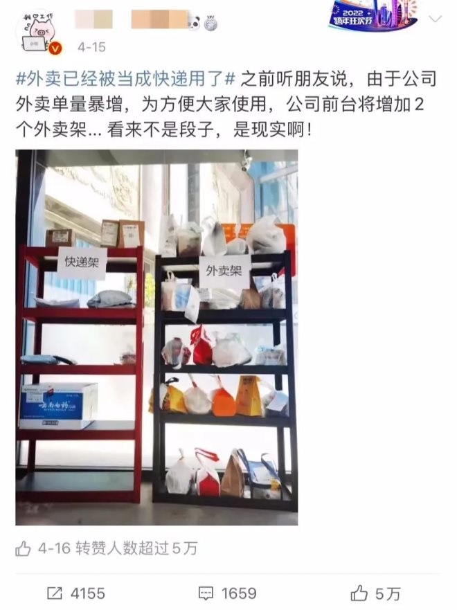 疫情反復,#外賣已經(jīng)被當成快遞用了#話題,在4月沖上微博熱搜榜。