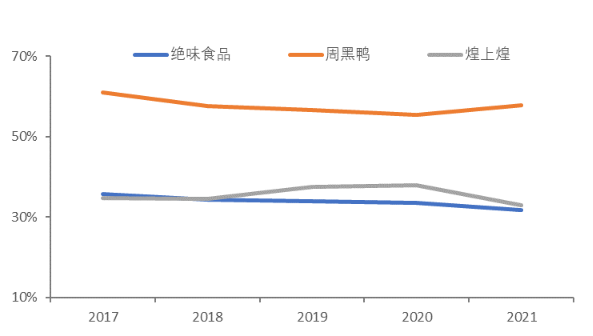 絕味食品加盟模式的低毛利一直受人詬病,對比三巨頭的2021年財報,可以發(fā)現(xiàn)絕味食品的毛利率再次墊底,僅為31.68%,而煌上煌毛利率為33%,更有周黑鴨以57.78%的毛利率遙遙領(lǐng)先。而絕味本身的毛利率也在去年再次下滑,主要原因在于其提高了加盟商的補貼費用、疫情下加大貨折及上游成本高位上漲等多方面原因。