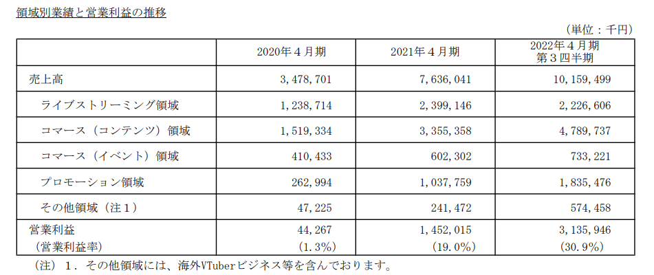 在日本,彩虹社已經(jīng)是虛擬偶像行業(yè)的頭部玩家,但它依然十分年輕——2017年成立,目前擁有216名員工,員工平均年齡30.2歲。這家成立并不算久的公司,進(jìn)入第五個(gè)財(cái)年,彩虹社前三個(gè)季度(自然年2021年5月1日-2022年1月31日)的營業(yè)收入達(dá)到101億日元(約5億人民幣),而其2017年4月-2018年5月的第一個(gè)財(cái)年,收入僅1662萬日元,四年多時(shí)間營收規(guī)模增長600倍。